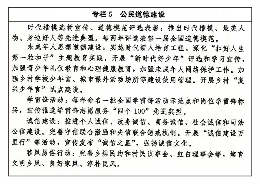 傳承弘揚中華傳統(tǒng)美德,加強社會公德、職業(yè)道德、家庭美德、個人品德建設,加強家庭、家教、家風建設。加強對革命、建設、改革時期各類先進典型的學習宣傳,尊崇褒揚英雄模范,關心關愛先進典型人物。健全家庭、學校、政府、社會相結合的思想道德教育體系,把立德樹人貫穿學校教育全過程。發(fā)揮優(yōu)秀文化產品陶冶道德情操的作用,完善市民公約、鄉(xiāng)規(guī)民約、學生守則、團體章程等社會規(guī)范,廣泛開展弘揚時代新風行動,深化道德領域突出問題治理。加強農村思想道德建設,創(chuàng)新文化科技衛(wèi)生“三下鄉(xiāng)”長效機制。