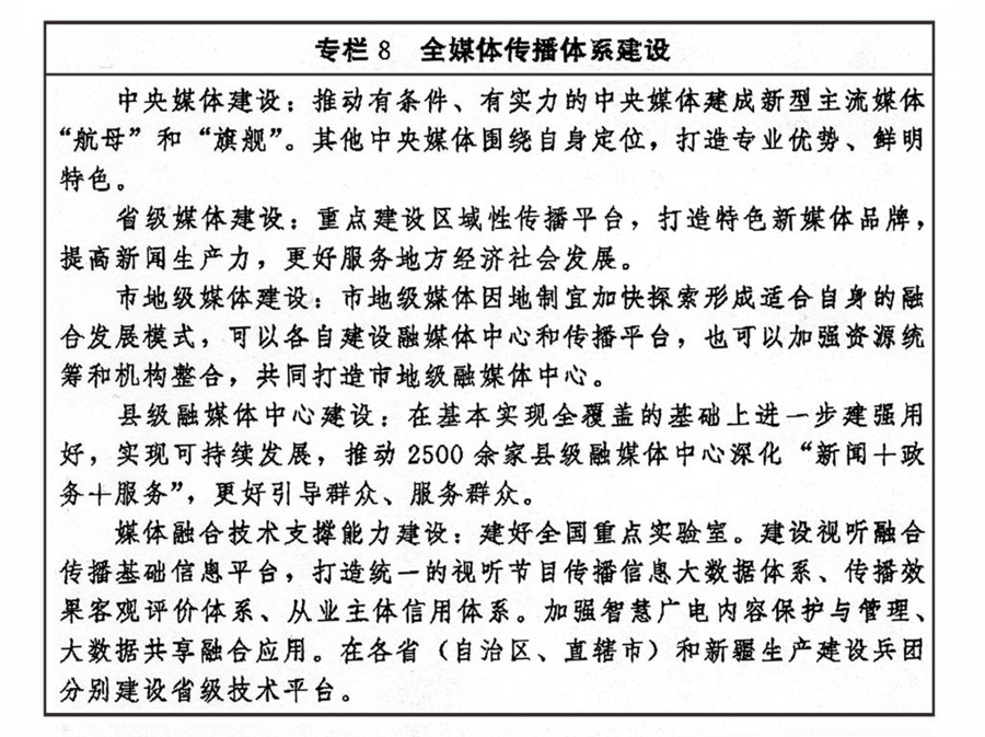 加快推進媒體深度融合發(fā)展,有效整合各種媒介資源、生產要素,推動在信息內容、技術應用、平臺終端、管理手段等方面共融互通,打造一批具有強大影響力、競爭力的新型主流媒體。統(tǒng)籌處理好傳統(tǒng)媒體和新興媒體、中央媒體和地方媒體、主流媒體和商業(yè)平臺、大眾化媒體和專業(yè)性媒體的關系,建立以內容建設為根本、先進技術為支撐、創(chuàng)新管理為保障的全媒體傳播體系。推進內容生產供給側結構性改革,完善高質量內容產出機制,推廣互動式、服務式、場景式傳播。強化新一代信息技術支撐引領作用,支持主流媒體重塑采編流程、建設平臺終端、優(yōu)化管理手段、強化版權保護、打造媒體資源數據庫、提升內容生產力、占據傳播制高點。創(chuàng)新媒體業(yè)態(tài)、傳播方式和運營模式,強化用戶連接,發(fā)揮制度優(yōu)勢和市場作用,增強主流媒體競爭力。