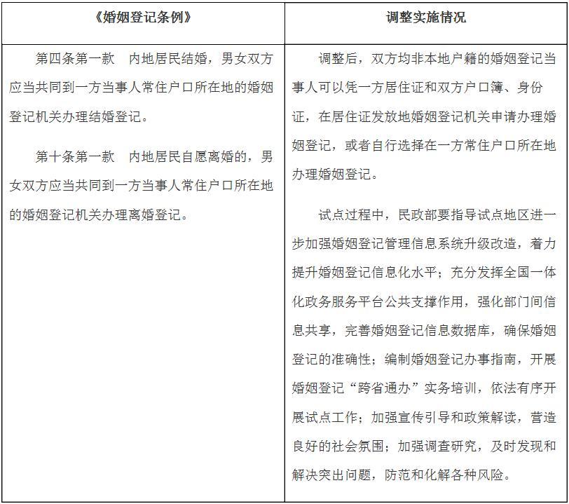 國務院決定在內(nèi)地居民婚姻登記“跨省通辦”試點地區(qū)暫時調(diào)整實施《婚姻登記條例》有關規(guī)定目錄