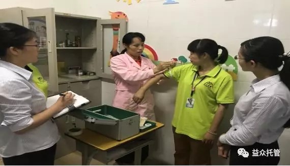 醫(yī)療角成立后,校區(qū)管理人員邀請(qǐng)了逸夫小學(xué)校醫(yī)梁惠珍老師為校區(qū)工作人員培訓(xùn)急救包扎、清創(chuàng)等技能,為托管工作人員普及急救知識(shí)。