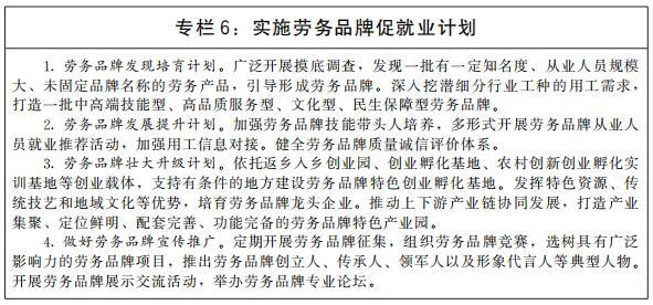 穩(wěn)定和擴大農(nóng)村勞動力外出就業(yè)規(guī)模。廣泛開展區(qū)域間勞務協(xié)作,健全勞務輸入集中區(qū)域與勞務輸出省份對接協(xié)調(diào)機制,加強勞動力跨區(qū)域精準對接,發(fā)展勞務組織和經(jīng)紀人,有序組織輸出地農(nóng)村勞動力外出務工。培育一批有地域特色、行業(yè)特征、技能特點,帶動農(nóng)村勞動力就業(yè)效果好的勞務品牌。實施農(nóng)民工素質提升工程,推進新生代農(nóng)民工職業(yè)技能提升計劃。創(chuàng)建一批農(nóng)村勞動力轉移就業(yè)示范縣。