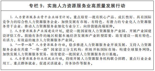 加快人力資源服務業(yè)高質量發(fā)展。推動人力資源服務與實體經(jīng)濟融合發(fā)展,引導人力資源服務機構圍繞產(chǎn)業(yè)基礎高級化、產(chǎn)業(yè)鏈現(xiàn)代化提供精準專業(yè)服務。鼓勵人力資源服務業(yè)管理創(chuàng)新、技術創(chuàng)新、服務創(chuàng)新和產(chǎn)品創(chuàng)新,大力發(fā)展人力資源管理咨詢、高級人才尋訪、人才測評等高技術、高附加值業(yè)態(tài)。實施人力資源服務業(yè)領軍人才培養(yǎng)計劃。開展“互聯(lián)網(wǎng)+人力資源服務”行動。深化人力資源服務領域對外開放,探索建設國家人力資源服務出口基地。