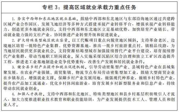 推動區(qū)域就業(yè)協(xié)調(diào)發(fā)展。支持東部地區(qū)發(fā)揮創(chuàng)新要素集聚優(yōu)勢,率先實現(xiàn)產(chǎn)業(yè)升級,開拓高質量就業(yè)新領域,培育高質量就業(yè)增長極。加快完善中西部和東北地區(qū)基礎設施,提升產(chǎn)業(yè)集聚區(qū)公共服務效能,引導產(chǎn)業(yè)向中西部和東北地區(qū)有序梯度轉移,推動就業(yè)機會向中西部和東北地區(qū)擴散。支持中西部和東北地區(qū)根據(jù)國家戰(zhàn)略導向和發(fā)展重點,對接先進生產(chǎn)要素和創(chuàng)新資源,發(fā)展特色優(yōu)勢產(chǎn)業(yè),改造提升傳統(tǒng)產(chǎn)業(yè),積極布局新興產(chǎn)業(yè),厚植就業(yè)創(chuàng)業(yè)沃土。