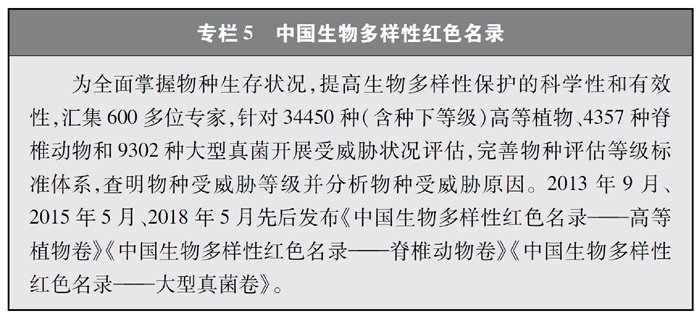 開展全國(guó)生物多樣性調(diào)查與評(píng)估。大力推進(jìn)生物多樣性保護(hù)重大工程實(shí)施,結(jié)合自然資源調(diào)查、生態(tài)系統(tǒng)監(jiān)測(cè)評(píng)估等工作,不斷完善生物多樣性調(diào)查與評(píng)估能力,首次將生物多樣性指標(biāo)納入生態(tài)質(zhì)量綜合評(píng)價(jià)指標(biāo)體系,引導(dǎo)地方加強(qiáng)生態(tài)文明建設(shè)與生物多樣性保護(hù)。開展自然資源調(diào)查,包括森林、草原、水、濕地、荒漠、海洋等,建立自然資源調(diào)查評(píng)價(jià)監(jiān)測(cè)制度。構(gòu)建了涵蓋2376個(gè)縣級(jí)行政單元、樣線總長(zhǎng)超過(guò)3.4萬(wàn)公里的物種分布數(shù)據(jù)庫(kù),建立物種資源調(diào)查及收集信息平臺(tái),準(zhǔn)確反映野生動(dòng)植物空間分布狀況。完成長(zhǎng)江經(jīng)濟(jì)帶、京津冀等國(guó)家戰(zhàn)略區(qū)域180多個(gè)縣級(jí)行政區(qū)生物多樣性調(diào)查與評(píng)估。組織開展近海漁業(yè)資源調(diào)查,初步掌握近海漁業(yè)資源狀況。陸續(xù)發(fā)布《中國(guó)植物紅皮書》《中國(guó)瀕危動(dòng)物紅皮書》《中國(guó)物種紅色名錄》《中國(guó)生物多樣性紅色名錄》,基本掌握生物多樣性總體情況,為加強(qiáng)生物多樣性保護(hù)奠定了科學(xué)基礎(chǔ)。