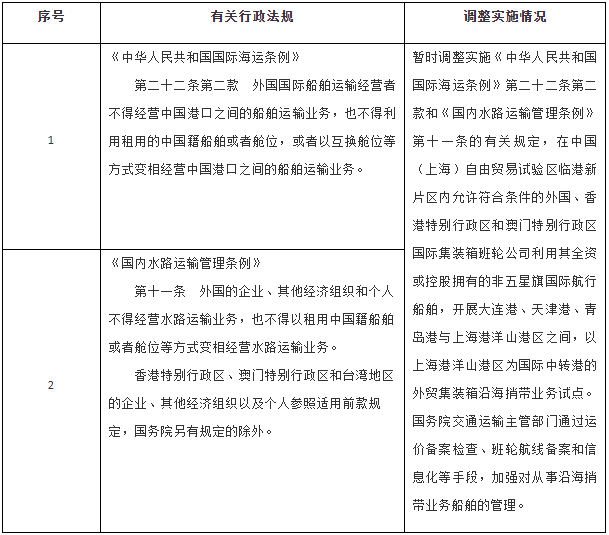 一、按照《中國(guó)(上海)自由貿(mào)易試驗(yàn)區(qū)臨港新片區(qū)總體方案》,同意自即日起至2024年12月31日,在中國(guó)(上海)自由貿(mào)易試驗(yàn)區(qū)臨港新片區(qū)暫時(shí)調(diào)整實(shí)施《中華人民共和國(guó)國(guó)際海運(yùn)條例》《國(guó)內(nèi)水路運(yùn)輸管理?xiàng)l例》的有關(guān)規(guī)定(目錄附后)。