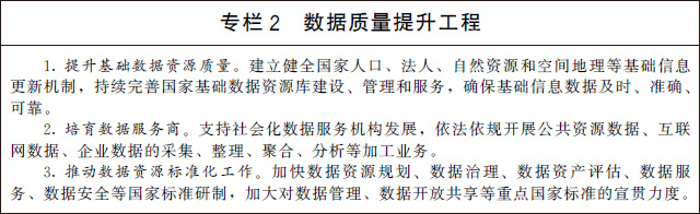 (一)強化高質(zhì)量數(shù)據(jù)要素供給。支持市場主體依法合規(guī)開展數(shù)據(jù)采集,聚焦數(shù)據(jù)的標注、清洗、脫敏、脫密、聚合、分析等環(huán)節(jié),提升數(shù)據(jù)資源處理能力,培育壯大數(shù)據(jù)服務產(chǎn)業(yè)。推動數(shù)據(jù)資源標準體系建設,提升數(shù)據(jù)管理水平和數(shù)據(jù)質(zhì)量,探索面向業(yè)務應用的共享、交換、協(xié)作和開放。加快推動各領(lǐng)域通信協(xié)議兼容統(tǒng)一,打破技術(shù)和協(xié)議壁壘,努力實現(xiàn)互通互操作,形成完整貫通的數(shù)據(jù)鏈。推動數(shù)據(jù)分類分級管理,強化數(shù)據(jù)安全風險評估、監(jiān)測預警和應急處置。深化政務數(shù)據(jù)跨層級、跨地域、跨部門有序共享。建立健全國家公共數(shù)據(jù)資源體系,統(tǒng)籌公共數(shù)據(jù)資源開發(fā)利用,推動基礎公共數(shù)據(jù)安全有序開放,構(gòu)建統(tǒng)一的國家公共數(shù)據(jù)開放平臺和開發(fā)利用端口,提升公共數(shù)據(jù)開放水平,釋放數(shù)據(jù)紅利。