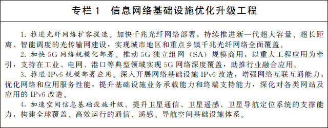 (一)加快建設信息網(wǎng)絡基礎設施。建設高速泛在、天地一體、云網(wǎng)融合、智能敏捷、綠色低碳、安全可控的智能化綜合性數(shù)字信息基礎設施。有序推進骨干網(wǎng)擴容,協(xié)同推進千兆光纖網(wǎng)絡和5G網(wǎng)絡基礎設施建設,推動5G商用部署和規(guī)模應用,前瞻布局第六代移動通信(6G)網(wǎng)絡技術(shù)儲備,加大6G技術(shù)研發(fā)支持力度,積極參與推動6G國際標準化工作。積極穩(wěn)妥推進空間信息基礎設施演進升級,加快布局衛(wèi)星通信網(wǎng)絡等,推動衛(wèi)星互聯(lián)網(wǎng)建設。提高物聯(lián)網(wǎng)在工業(yè)制造、農(nóng)業(yè)生產(chǎn)、公共服務、應急管理等領(lǐng)域的覆蓋水平,增強固移融合、寬窄結(jié)合的物聯(lián)接入能力。