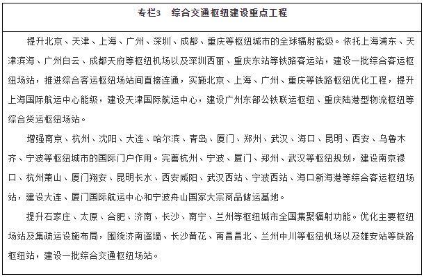 優(yōu)化綜合交通樞紐城市功能。提升國(guó)際性綜合交通樞紐的全球聯(lián)通水平和資源要素配置能力,增強(qiáng)部分樞紐國(guó)際門(mén)戶功能。優(yōu)化全國(guó)性綜合交通樞紐客貨中轉(zhuǎn)設(shè)施、集疏運(yùn)網(wǎng)絡(luò)及客運(yùn)場(chǎng)站間快速連接系統(tǒng)。增強(qiáng)區(qū)域性綜合交通樞紐的銜接轉(zhuǎn)運(yùn)能力,發(fā)展口岸樞紐。強(qiáng)化不同層級(jí)綜合交通樞紐城市之間功能互補(bǔ)、設(shè)施連通、運(yùn)行協(xié)同。
