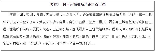 擴(kuò)大航空網(wǎng)絡(luò)覆蓋。推動(dòng)區(qū)域機(jī)場(chǎng)群協(xié)同發(fā)展,建設(shè)京津冀、長(zhǎng)三角、粵港澳大灣區(qū)、成渝等世界級(jí)機(jī)場(chǎng)群。適時(shí)啟動(dòng)能力緊張樞紐機(jī)場(chǎng)改擴(kuò)建工程,強(qiáng)化樞紐機(jī)場(chǎng)綜合保障能力。合理加密機(jī)場(chǎng)布局,穩(wěn)步建設(shè)支線機(jī)場(chǎng)和專業(yè)性貨運(yùn)樞紐機(jī)場(chǎng),提升綜合性機(jī)場(chǎng)貨運(yùn)能力和利用率。有序推進(jìn)通用機(jī)場(chǎng)規(guī)劃建設(shè),構(gòu)建區(qū)域短途運(yùn)輸網(wǎng)絡(luò),探索通用航空與低空旅游、應(yīng)急救援、醫(yī)療救護(hù)、警務(wù)航空等融合發(fā)展。優(yōu)化航路航線網(wǎng)絡(luò),加強(qiáng)軍民航空管基礎(chǔ)設(shè)施建設(shè),推廣應(yīng)用空管新技術(shù)。