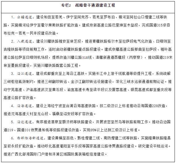 加強(qiáng)戰(zhàn)略骨干通道建設(shè)。推進(jìn)出疆入藏通道建設(shè),擴(kuò)大甘新、青新、青藏、川藏四條內(nèi)聯(lián)主通道通行能力,穩(wěn)步推進(jìn)川藏鐵路建設(shè),加快推進(jìn)新藏鐵路和田至日喀則段前期工作、適時(shí)啟動(dòng)重點(diǎn)路段建設(shè),有序推進(jìn)滇藏鐵路前期工作,密實(shí)優(yōu)化航空航線網(wǎng)絡(luò)布局,構(gòu)建多向聯(lián)通的通道布局。暢通沿江通道,加快建設(shè)沿江高鐵,優(yōu)化以高等級(jí)航道和干線鐵路、高速公路為骨干的沿江綜合運(yùn)輸大通道功能。升級(jí)沿海通道,提高鐵路通道能力,推進(jìn)高速公路繁忙路段擴(kuò)容改造,提升港口航道整體效能,構(gòu)建大容量、高品質(zhì)的運(yùn)輸走廊。貫通沿邊通道,提級(jí)改造普通國(guó)省干線,推進(jìn)重點(diǎn)方向沿邊鐵路建設(shè),提高安全保障水平。建設(shè)西部陸海新通道,發(fā)揮鐵路在陸路運(yùn)輸中的骨干作用和港口在海上運(yùn)輸中的門(mén)戶作用,強(qiáng)化東、中、西三條通路,形成大能力主通道,銜接國(guó)際運(yùn)輸通道。