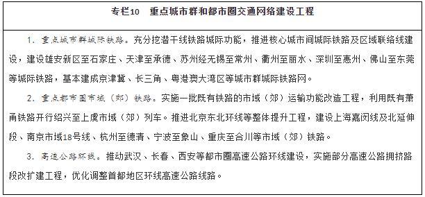 強(qiáng)化重點(diǎn)城市群城際交通建設(shè)。圍繞京津冀、長(zhǎng)三角、粵港澳大灣區(qū)、成渝、長(zhǎng)江中游等城市群,以軌道交通、高速公路為骨干,提升城際運(yùn)輸通道功能,加強(qiáng)核心城市快速直連,構(gòu)建多節(jié)點(diǎn)、網(wǎng)絡(luò)化的城際交通網(wǎng),實(shí)現(xiàn)城市群內(nèi)主要城市間2小時(shí)通達(dá)。整體推進(jìn)京津冀、長(zhǎng)三角、粵港澳大灣區(qū)城際鐵路和市域(郊)鐵路建設(shè),有序推動(dòng)成渝地區(qū)雙城經(jīng)濟(jì)圈城際鐵路和市域(郊)鐵路建設(shè),加強(qiáng)與高速鐵路、普速鐵路一體銜接,擴(kuò)大對(duì)5萬(wàn)人口以上城鎮(zhèn)的有效覆蓋。