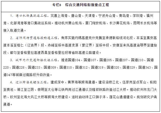 建設(shè)多節(jié)點(diǎn)、網(wǎng)格狀、全覆蓋的京津冀一體化綜合交通網(wǎng)絡(luò),基本建成軌道上的京津冀,高標(biāo)準(zhǔn)、高質(zhì)量打造雄安新區(qū)對(duì)外交通網(wǎng)絡(luò),加強(qiáng)北京城市副中心與中心城區(qū)、廊坊北三縣交通基礎(chǔ)設(shè)施互聯(lián)互通,強(qiáng)化北京冬奧會(huì)、冬殘奧會(huì)交通保障。依托長(zhǎng)江黃金水道,整體設(shè)計(jì)推進(jìn)長(zhǎng)江經(jīng)濟(jì)帶綜合交通運(yùn)輸體系建設(shè),補(bǔ)強(qiáng)沿江高鐵和鐵路貨運(yùn)能力,全力打通公路省際待貫通路段,提升江海聯(lián)運(yùn)、鐵水聯(lián)運(yùn)發(fā)展水平。推進(jìn)粵港澳大灣區(qū)基礎(chǔ)設(shè)施互聯(lián)互通,優(yōu)化航運(yùn)和航空資源配置,加強(qiáng)港澳與內(nèi)地的交通聯(lián)系,支持香港提升國(guó)際航運(yùn)、國(guó)際航空樞紐地位。推動(dòng)長(zhǎng)三角地區(qū)交通運(yùn)輸更高質(zhì)量一體化發(fā)展,加快對(duì)外交通、城際交通、都市圈交通高效銜接和有機(jī)融合,協(xié)同推進(jìn)港航、海事一體化發(fā)展,推動(dòng)上海市、江蘇省、浙江省、安徽省共建輻射全球的航運(yùn)樞紐,加快提升江蘇通州灣江海聯(lián)動(dòng)示范區(qū)功能,打造長(zhǎng)江集裝箱運(yùn)輸新出??凇?gòu)建海南島內(nèi)暢通、陸島連通、全球通達(dá)的現(xiàn)代綜合交通運(yùn)輸體系,建設(shè)現(xiàn)代化綜合交通樞紐,穩(wěn)步推進(jìn)自由貿(mào)易港建設(shè)。構(gòu)建黃河流域綠色安全便捷綜合交通網(wǎng)絡(luò),強(qiáng)化跨區(qū)域大通道建設(shè)。