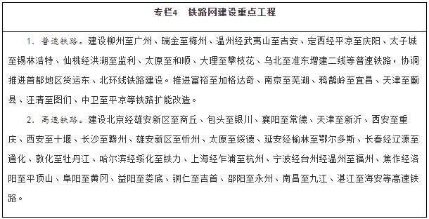 建設(shè)現(xiàn)代化鐵路網(wǎng)。堅(jiān)持客貨并重、新建改建并舉、高速普速協(xié)調(diào)發(fā)展,加快普速鐵路建設(shè)和既有鐵路擴(kuò)能改造,著力消除干線瓶頸,推進(jìn)既有鐵路運(yùn)能緊張路段能力補(bǔ)強(qiáng),加快提高中西部地區(qū)鐵路網(wǎng)覆蓋水平。加強(qiáng)資源富集區(qū)、人口相對(duì)密集脫貧地區(qū)的開(kāi)發(fā)性鐵路和支線鐵路建設(shè)。推進(jìn)高速鐵路主通道建設(shè),提升沿江、沿海、呼南、京昆等重要通道以及京滬高鐵輔助通道運(yùn)輸能力,有序建設(shè)區(qū)域連接線。綜合運(yùn)用新技術(shù)手段,改革創(chuàng)新經(jīng)營(yíng)管理模式,提高鐵路網(wǎng)整體運(yùn)營(yíng)效率。統(tǒng)籌考慮運(yùn)輸需求和效益,合理規(guī)劃建設(shè)鐵路項(xiàng)目,嚴(yán)控高速鐵路平行線路建設(shè)。