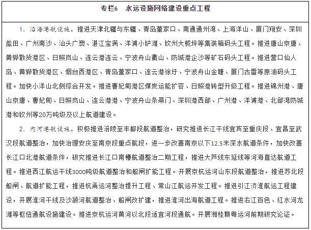 優(yōu)化暢通水運(yùn)設(shè)施網(wǎng)絡(luò)。建設(shè)京津冀、長(zhǎng)三角、粵港澳大灣區(qū)世界級(jí)港口群,支持山東打造世界一流的海洋港口,推進(jìn)東北地區(qū)沿海港口一體化發(fā)展,優(yōu)化港口功能布局,推動(dòng)資源整合和共享共用。有序推進(jìn)沿海港口專業(yè)化碼頭及進(jìn)出港航道等公共設(shè)施建設(shè)。適度超前建設(shè)糧食、能源、礦產(chǎn)資源的接卸、儲(chǔ)存、中轉(zhuǎn)設(shè)施,推進(jìn)沿海沿江液化天然氣碼頭規(guī)劃建設(shè)。提升內(nèi)河港口專業(yè)化、規(guī)?;?,合理集中布局集裝箱、煤炭、鐵礦石、商品汽車等專業(yè)化碼頭。加強(qiáng)內(nèi)河高等級(jí)航道擴(kuò)能升級(jí)與暢通攻堅(jiān)建設(shè),完善長(zhǎng)江、珠江、京杭運(yùn)河和淮河等水系內(nèi)河高等級(jí)航道網(wǎng)絡(luò),進(jìn)一步提升珠三角高等級(jí)航道網(wǎng)出海能力,全面加強(qiáng)長(zhǎng)三角、珠江—西江高等級(jí)航道網(wǎng)未達(dá)標(biāo)段建設(shè)。推動(dòng)重要支流航道和庫(kù)湖區(qū)航道、內(nèi)河旅游航道、便民碼頭建設(shè)。