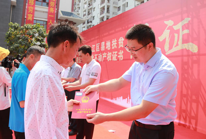 “老鄉(xiāng)家園—迎龍易地扶貧搬遷安置小鎮(zhèn)”是由益眾投資公司作為業(yè)主負(fù)責(zé)實(shí)施建設(shè),2017年3月開工,同年11月建成安置住房11棟1304套。日前,公司順利辦理了第一批26戶搬遷戶不動(dòng)產(chǎn)權(quán)證書,全面啟動(dòng)安置小鎮(zhèn)不動(dòng)產(chǎn)權(quán)證書發(fā)放工作。