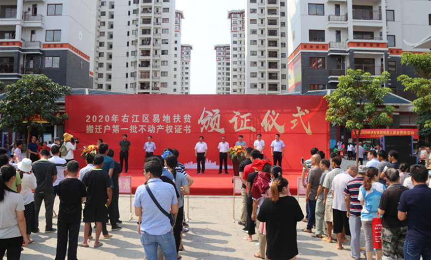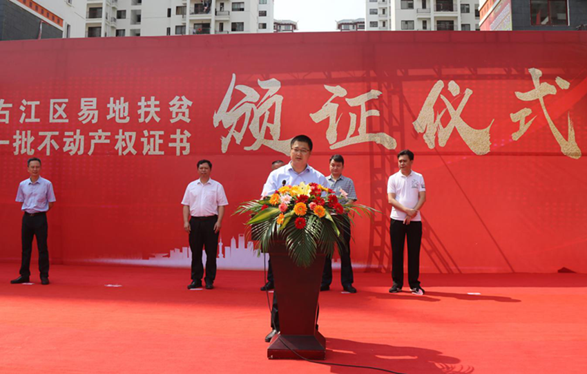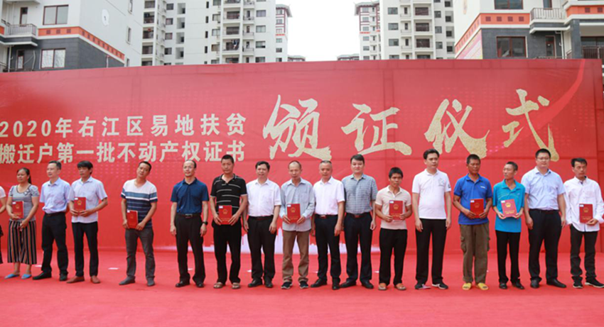 5月16日上午,右江區(qū)“老鄉(xiāng)家園—迎龍易地扶貧搬遷安置小鎮(zhèn)”搬遷戶不動(dòng)產(chǎn)權(quán)證書頒證儀式在安置小鎮(zhèn)舉行,第一批26戶搬遷戶順利拿到了產(chǎn)權(quán)證書。百色市發(fā)改委副主任、市水庫和扶貧易地安置管理局局長羅加攀,右江區(qū)委常委、區(qū)人民政府副區(qū)長岑萬興,右江區(qū)委常委、宣傳部部長、區(qū)人民政府副區(qū)長王世凡,右江區(qū)委常委、辦公室主任盧靈及右江區(qū)直單位、鄉(xiāng)鎮(zhèn)代表,廣西百色益眾投資有限公司董事長、總經(jīng)理趙家臣出席儀式。儀式由王世凡主持。